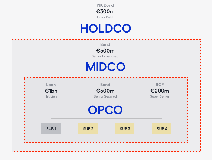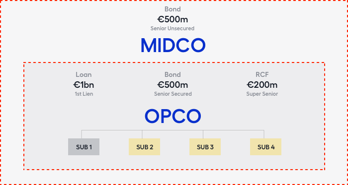 A restricted group also includes senior unsecured bonds. MidCo's ability to pay interest on its bonds is reliant on cash flow from OpCo. This means that any repayment revenues after the senior secured debt has been repaid benefit them on an unsecured basis.